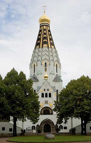 Sie befindet sich in der Philipp-Rosenthal-Straße am Südrand des Friedensparks und wurde zur Erinnerung an die 22 000 in der Völkerschlacht bei Leipzig 1813 gefallenen russischen Soldaten errichtet und 1913 geweiht; Vorbild war die Moskauer Himmelsfahrtkirche von 1532. Eine 18 Meter hohe Ikonenwand, Standarten und Tafeln mit den Namen der an den Kämpfen beteiligten Kosakenregimenter schmücken die russisch-orthodoxe Kirche im Inneren.